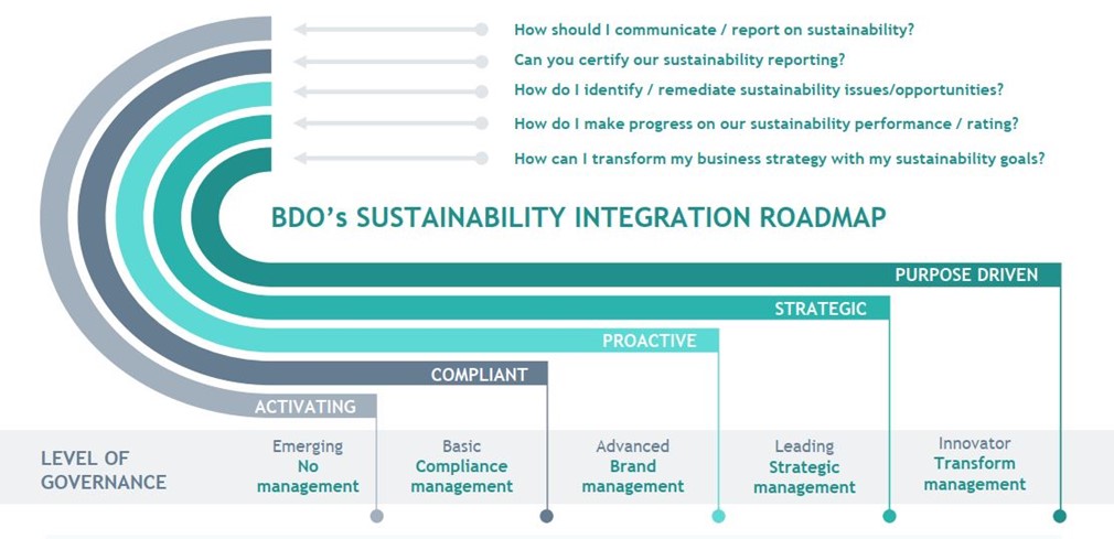 O parte a provocării pentru multe companii este să înțeleagă de unde să înceapă. Foaia de parcurs BDO nu este menită să fie liniară, iar adoptarea și execuția sustenabilității nu vor fi aceleași în fiecare afacere. În unele cazuri, o companie poate depăși câțiva pași sau poate fi forțată să se alăture în etapa de „conformitate”. Dar ceea ce este important este să înțelegem că este o călătorie – o călătorie continuă care va crește în valoare și importanță.
