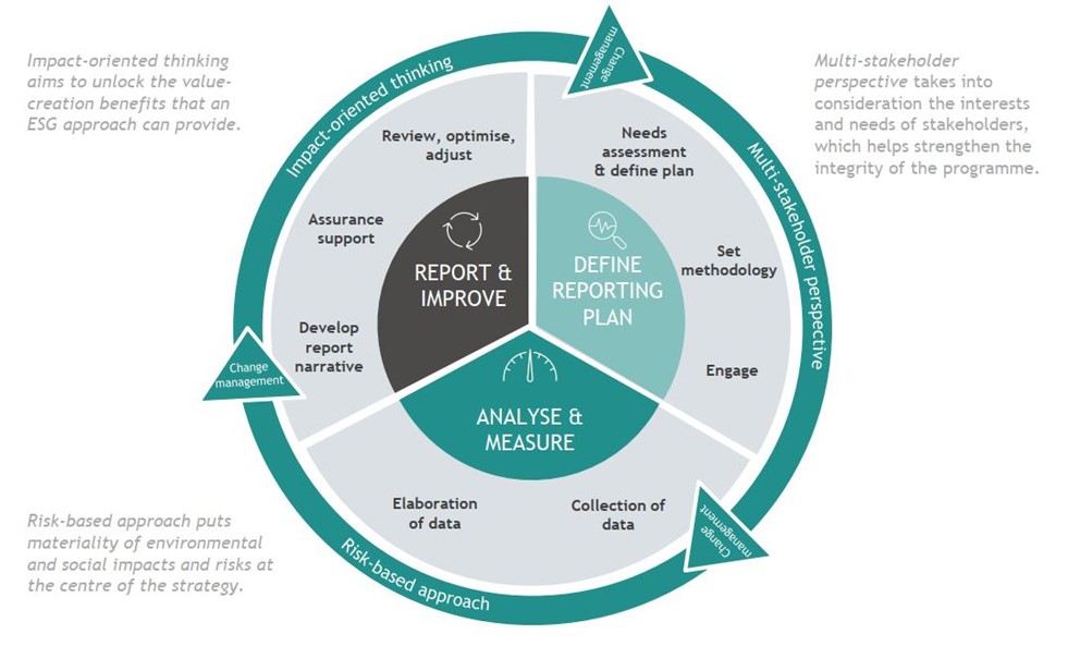 DEFINIREA PLANULUI DE RAPORTARE. Definiți și planificați activitățile care trebuie desfășurate, ținând cont de obiectivele corporative și de coerența cu standardele de raportare non-financiară recunoscute la nivel internațional și alte cadre de reglementare recunoscute ca fiind cele mai bune practici. BDO sprijină organizația în stabilirea procesului, identificarea celei mai adecvate metodologii, alinierea la prioritățile corporative, definirea parametrilor și activităților, efectuarea evaluării riscului de materialitate și asigurarea angajamentului părților interesate.