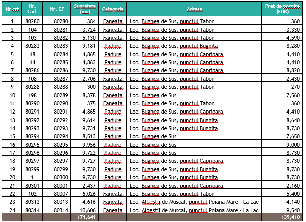 Pretul de pornire total pentru cele 25 de loturi de teren este de 883.192,76 EUR, exclusiv TVA.